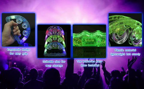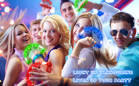 These light up flashing tambourines are cool party favors for both kids and adults, perfect for birthday party, carnivals, concerts, karaoke, music festivals, raves, weddings, camping, bachelor party, clubs, sports events, celebrations, Halloween, Christmas, or any other night activities. The glow in the dark tambourine definitely will be a hit at your party!