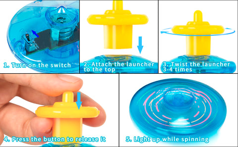 • Simple operation. Attach the launcher to the lighting up spinner top, twist 3-4 times and then press the button to release it.
