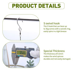 The diameter of the kinetic pinwheel is about 11.8inch/30cm, moderate size and the 360 degrees swivel hook for your easy hanging and removal.